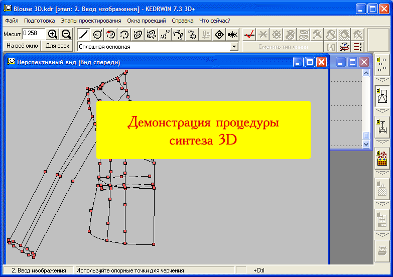 Надо заметить, что для указания взаимодействия плоских проекций между собой для синтеза пространственной модели, нам необходимы точки на этих проекциях. Хотя бы одна единственная на каждой проекции. Эти стыковочные точки можно себе представить так, что они являются проекциями одной и той же точки в пространстве на те плоские образующие проекции, из которых мы собираем эту пространственную модель. Просто мы теперь их собираем в обратном порядке. Для технологии конструирования с использованием манекена эти точки по умолчанию создаются автоматически на углах рисунка манекена. Для технологии по фотографии клиента их надо создавать вручную.