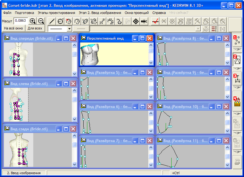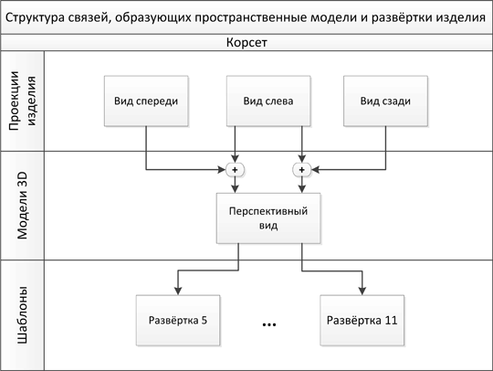 Проекции изделия выступают в роли окон ввода графической информации. Однажды созданная схема связей позволяет автоматически повторять действия по синтезу пространственной модели изделия при любых изменениях на исходных проекциях. И далее распространять так же автоматически изменения на шаблоны лекал, минимизируя ручную работу по редактированию проекта и адаптации его для разных размерных параметров.
